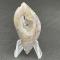 Amethyst Sage Agate, a hand-cut and polished semi-precious cabochon cut from a stone found in the Bilk Mountains near Denio, Nevada. This stone is cut in the shape of a skewed navette with a crystal vug in the center of a subtle golden and amethyst colored background. The stone is cut with both a lower and upper girdle to facilitate easy stone setting. The stone is polished to a high vitreous luster.