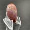 A hand cut and polished semi-precious cabochon made from an Arizona Petrified Wood stone. The stone has a unique pattern with half of the stone in a burnt-red moss and the other half in a maroon moss with a band of yellow highlighted dots separating the two regions.