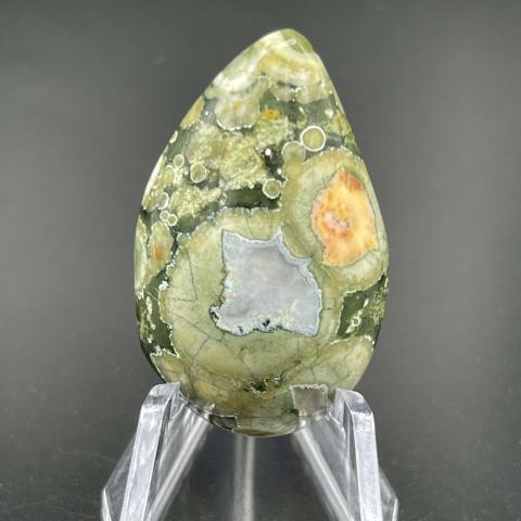 The face of this specimen has two irregular shaped orbs surrounded by green bands. The remainder of the stone has various shades of greens and pale yellows.